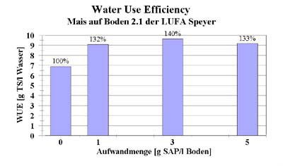 Zum Einfluss von Stockosorb auf den Bodenwasserhaushalt wurden verschiedene Versuche angelegt und ausgewertet. U.a. konnten wir nachweisen, dass das Wasserspeichervermögen und die Water Use Efficincy signifikant verbessert werden können (Grafiken unten).